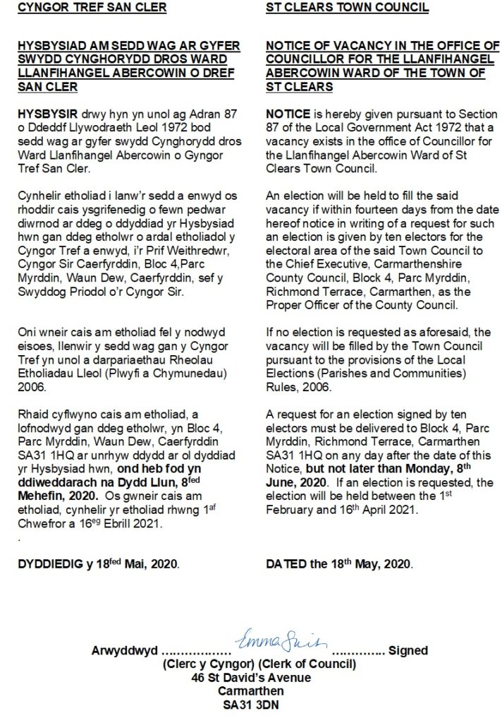 Hysbysiad am sedd wag - Ward Llanfihangel Abercowin