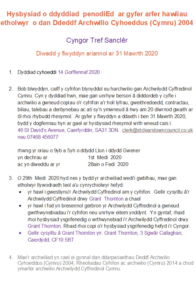 Hysbysiad o ddyddiad penodiEd ar gyfer arfer hawliau etholwyr o dan Ddeddf Archwilio Cyhoeddus (Cymru) 2004